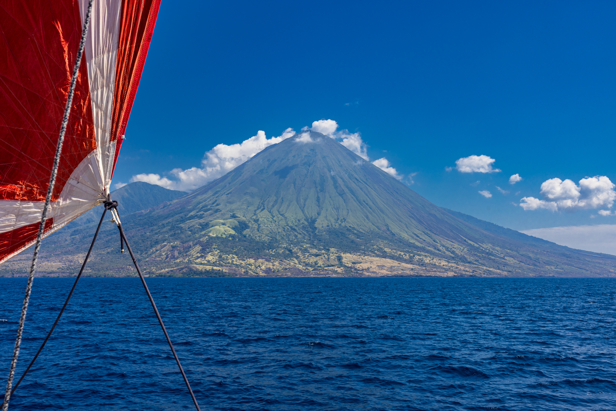 A tribord l’île Sangeang et son imposant volcan qui culmine à 1949m, a bâbord Sumbawa, quand à elle, dominée par le Tambora, volcan encore actif de 2850m.