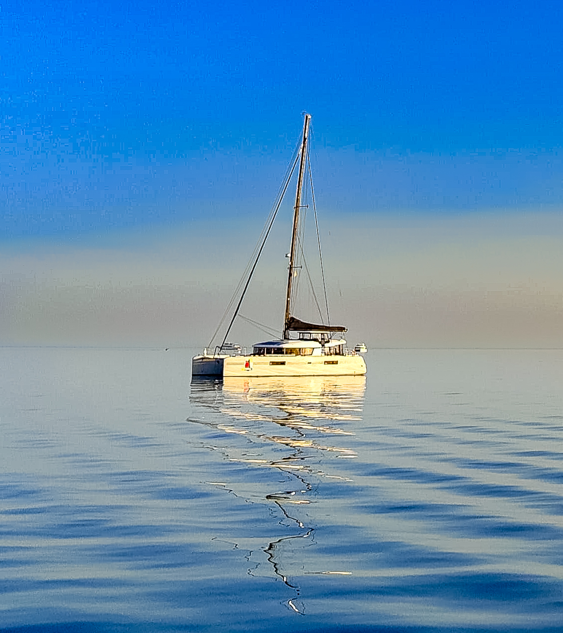 La navigation est facile avec du vent portant et une mer calme favorisant une bonne vitesse moyenne, 7 nœuds, malgré des périodes d’accalmie parcourues avec un moteur.